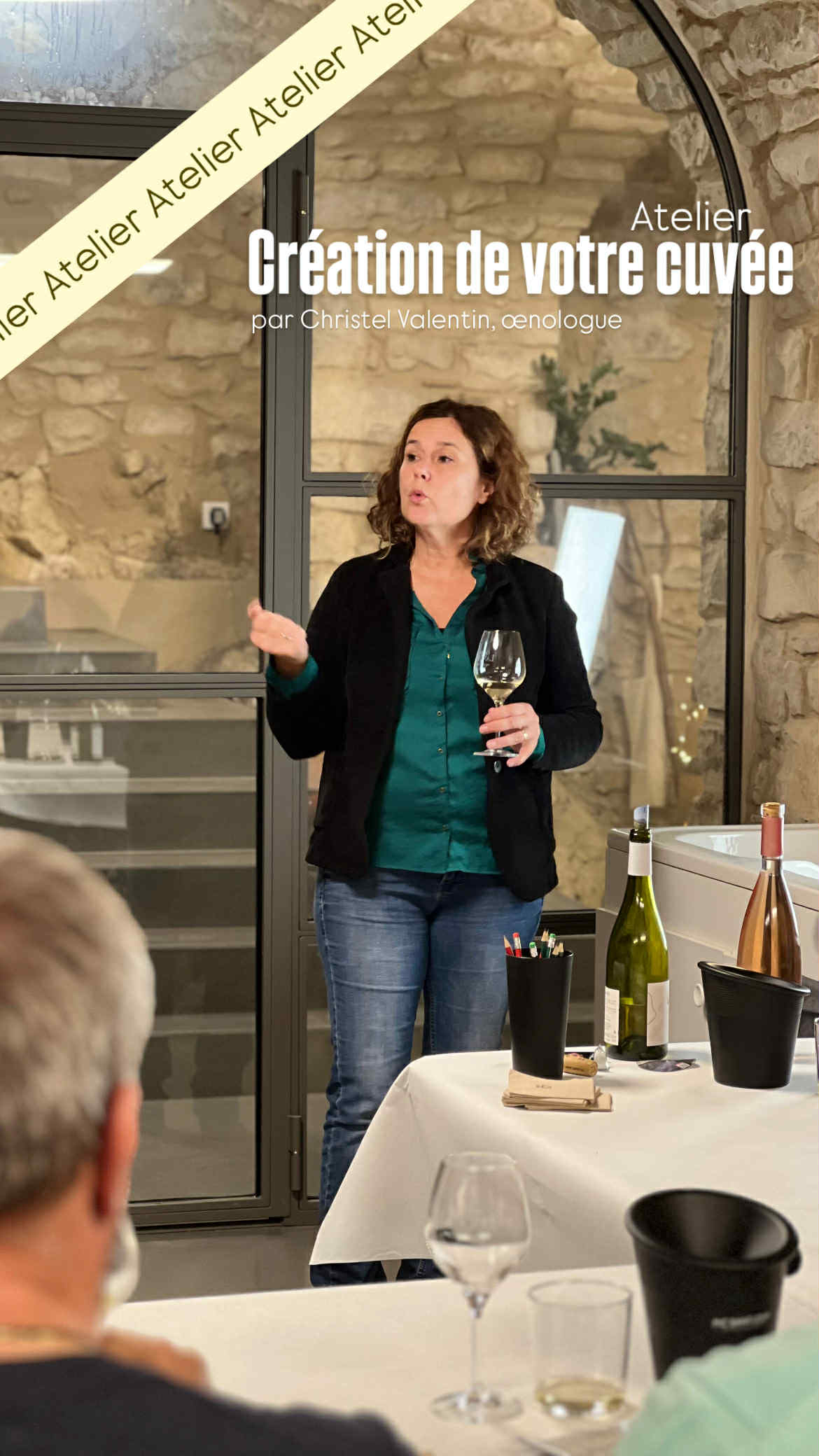 Christel Valentin, vigneronne et œnologue du domaine, vous propose un atelier "Assemblage : Création de votre cuvée". Découvrez l'art de l'assemblage à travers différents cépages, réalisez votre cuvée et repartez avec votre création